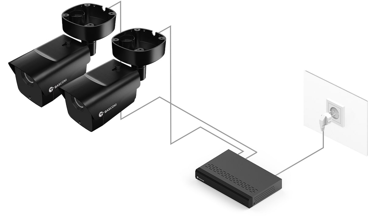 95 % de nos clients n’avaient jamais installé de système de vidéosurveillance auparavant, mais ont pu installer ce système Bascom eux-mêmes. Fixez les caméras au mur ou au plafond, branchez-les et le système fonctionne.