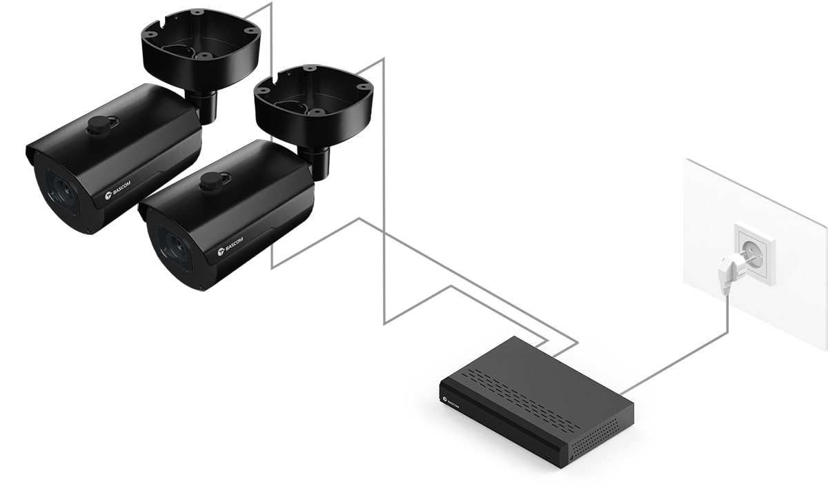 95 % de nos clients n’avaient jamais installé de système de vidéosurveillance auparavant, mais ont pu installer ce système Bascom eux-mêmes. Fixez les caméras au mur ou au plafond, branchez-les et le système fonctionne.
