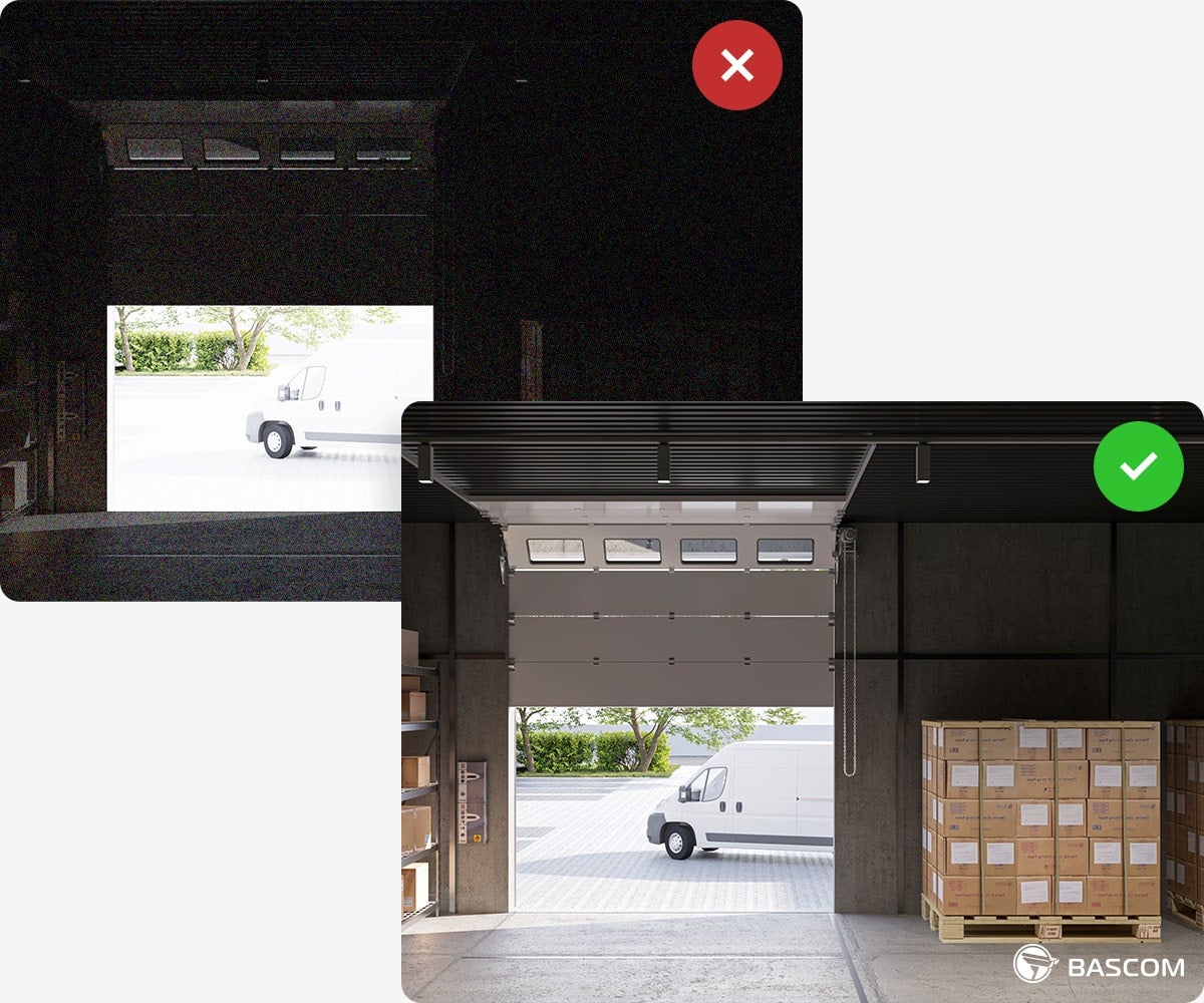 Dès que la lumière faiblit, les caméras Bascom PLUS activent automatiquement leur mode nuit, utilisant une technologie infrarouge avancée. Elles peuvent ainsi fournir une vision claire même dans l’obscurité totale – là où l’œil humain est incapable de distinguer quoi que ce soit – jusqu’à une distance de 50 mètres.