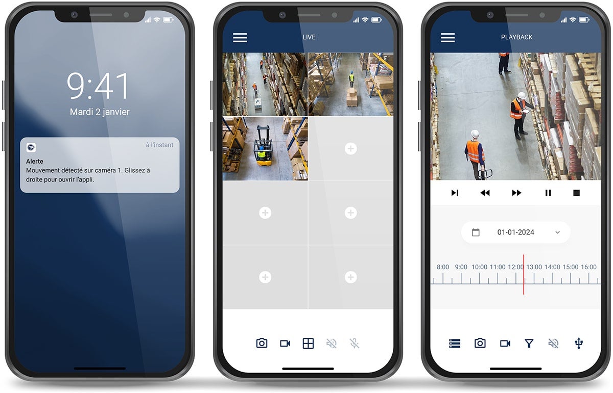 Activez les notifications sur votre smartphone en cas de détection de mouvement. Les caméras de ce système intègrent une détection intelligente basée sur l’IA, capable de distinguer les personnes et véhicules des mouvements sans importance. Vous ne recevez que les alertes qui comptent.